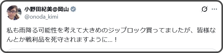 ちなみに、小野田氏は、コミケで購入した本などを雨から守るためにジップロックを購入して当日に向けて備えていたそう。