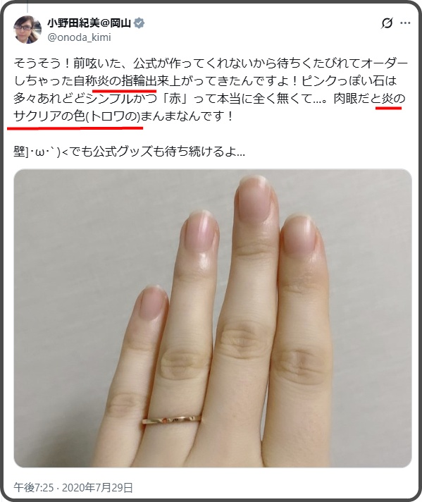 一方で、小野田氏は薬指にはめている指輪のことを『炎の指輪』と呼んでいます。