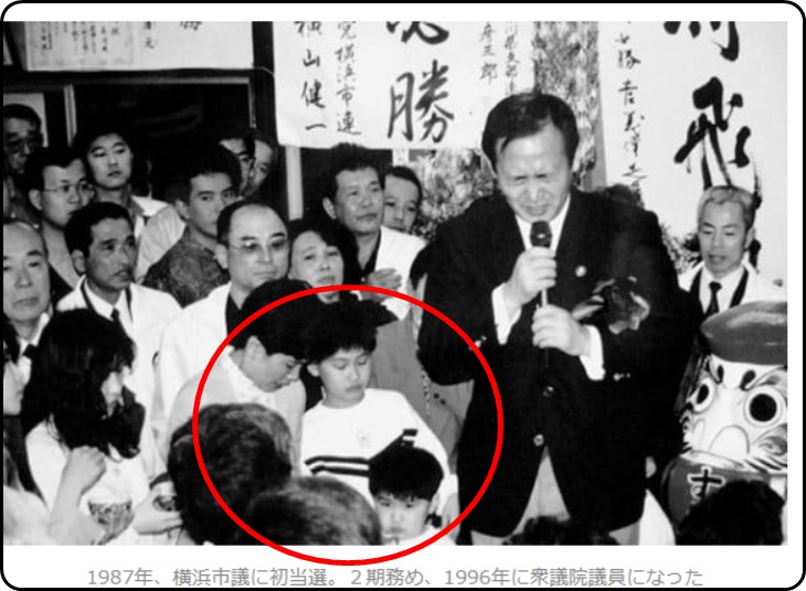 菅氏が1987年の横浜市議に初当選した時の画像に、当時6歳と3歳位の長男と次男と思われる子供が映っています。